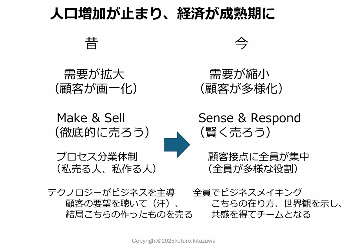 北澤氏がこう主張する背景には、人口減少による需要縮小がある。人口が増え、需要が拡大していた時代には、経済は右肩上がりで成長し、周囲と同じことを効率よく行うことが合理的とされてきた。その結果、企業活動は細かく分業化し、「作る人」と「売る人」という役割分担が生まれ、営業の役割はセールス活動であるという認識が定着していった。