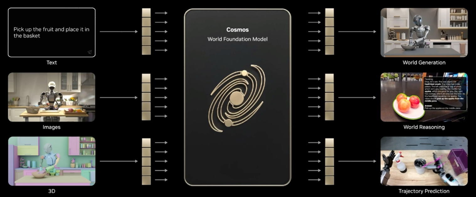 エヌビディアの世界基盤モデル(World Foundation Model)とは、「NVIDIA Cosmos」プラットフォームの中核をなす、AIに物理世界を理解・学習させるための「フィジカルAI」の基盤である。9000兆トークン(2000万時間分の動画データ)で学習し、テキスト・画像・動画を入力することで物理法則に従った高品質な映像やシミュレーションを生成でき、汎用的なロボットの学習・展開を可能にする(出所:ces.tech)拡大画像表示