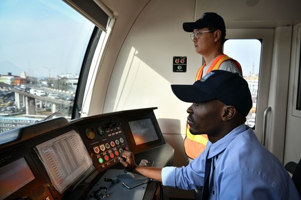 ナイジェリアのラゴスで、中国土木工程建設集団(CCECC)は2022年12月にラゴス鉄道大量輸送(LRMT)ブルーライン第1期工事を完成させている。写真は中国人運転士と現地の運転士(写真:新華社/共同通信イメージズ)