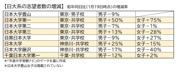 男女とも増が日本大学第一、男女とも減が日本大学第二、日本大学藤沢、男子が増、女子減が日本大学第三と日本大学。男子が減、女子増が目黒日本大学、千葉日本大学第一。日本大学豊山も減だった。