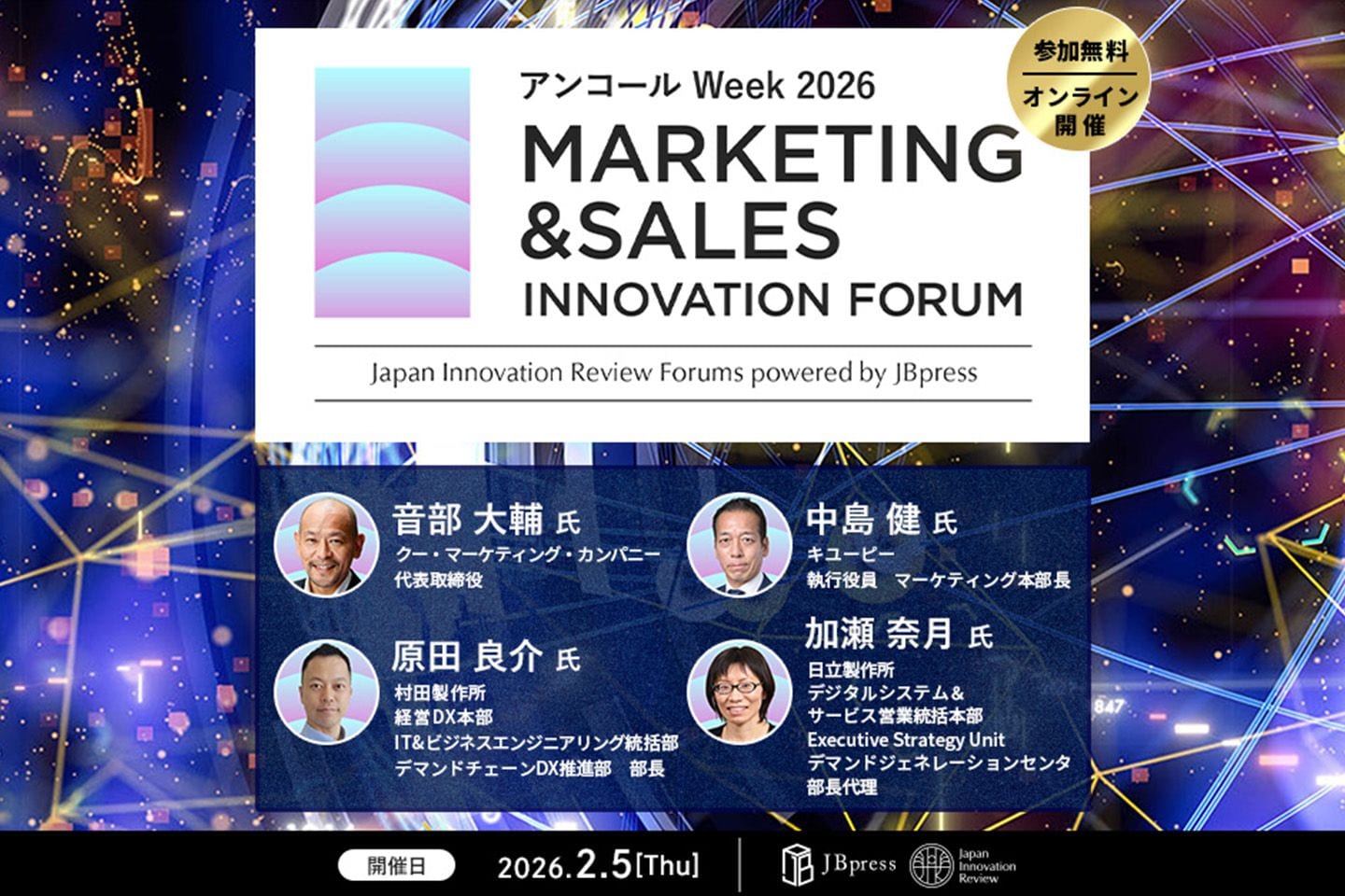 JBpress/Japan Innovation Reviewでは、2月5日(木)に「マーケティング&セールスイノベーションフォーラム(アンコール Week 2026)」を開催します。本セミナーでは、クー・マーケティング・カンパニー 代表取締役の音部大輔氏が「実務で『戦略』を機能させるための思考法」について解説します。また、日立製作所 デジタルシステム&サービス営業統括本部の加瀬奈月氏が「日立の営業活動におけるデジタルマーケティング導入の取り組み」について紹介し、村田製作所 IT&ビジネスエンジニアリング統括部の原田良介氏は「AI変革期における村田製作所の電子部品ビジネスの課題と戦略」について語ります。このほか、キユーピー 執行役員 マーケティング本部長の中島健氏による「全社最適化DX戦略」など注目のセッションも配信されます。進化するマーケティング&セールスの勝ち筋を学べる機会となりますので、ぜひご参加ください。