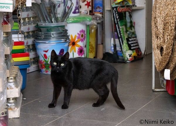 市場に店を出す人たちが猫たちの世話をしていますが、荒物屋の女性主人もその一人です。ボウルにミルクを入れて店の前に置き、猫に知らせる声を出すと、さっそく黒猫が現れ飲んでいました。顎にミルクがついてしまっています。