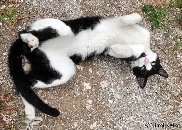 目が大きくてかわいいい顔立ちのメス猫は、ゴロンゴロンの動きもやわらかで、ほっぺたに前足を添える仕草がとても愛くるしかったです。「かわいいねー」と声をかけると、彼女もまんざらでもなさそうにますます軽快にゴロンゴロンしていました。