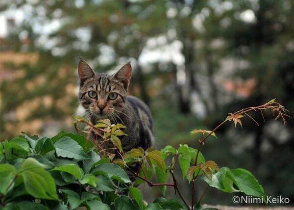 小さな広場にある塀の上を歩いていた猫が立ち止まりました。猫の視線の先にあったのが、次の看板です。木漏れ日の影が動くのに興味をひかれて見ていたのかもしれません。