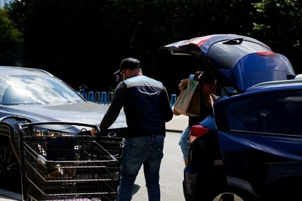 アマゾン傘下のホールフーズ・マーケットで商品を駐車場まで運び積み込むのを手伝うアマゾン社員(2025年9月3日フィラデルフィアで、写真:ロイター/アフロ)