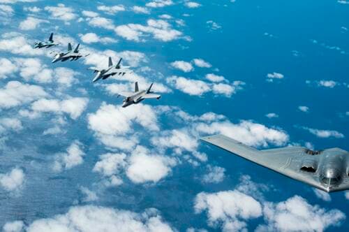 B-2爆撃機(右)と編隊を組んで飛ぶ2機のEA-18G電子戦機(左4機のうちの中央2機、2022年3月28日撮影、米空軍のサイトより)