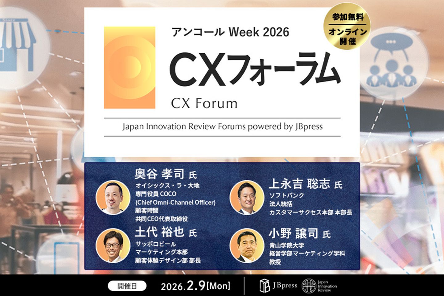 JBpress/Japan Innovation Reviewでは2月9日(月)に「CXフォーラム(アンコール Week 2026)」を開催します。本セミナーでは、オイシックス・ラ・大地 専門役員 COCO (Chief Omni-Channel Officer)の奥谷孝司氏による最新撮りおろし講演を配信。ニューヨークで開催される世界最大級のリテールカンファレンス「NRF 2026」を顧客起点で読み解き、2026年「次に来る」CXトレンドを解説します。また、ソフトバンク 法人統括 カスタマーサクセス本部 本部長の上永吉聡志氏、サッポロビール マーケティング本部 顧客体験デザイン部 部長の土代裕也氏、青山学院大学 経営学部マーケティング学科 教授の小野譲司氏らの講演を再配信します。ぜひご参加ください。