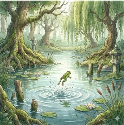 あえて言えば「蛙飛び出た 水の音」みたいなものですが、水中からカエルが飛び出しても、あのような飛沫にはなりません。ナンセンスです。