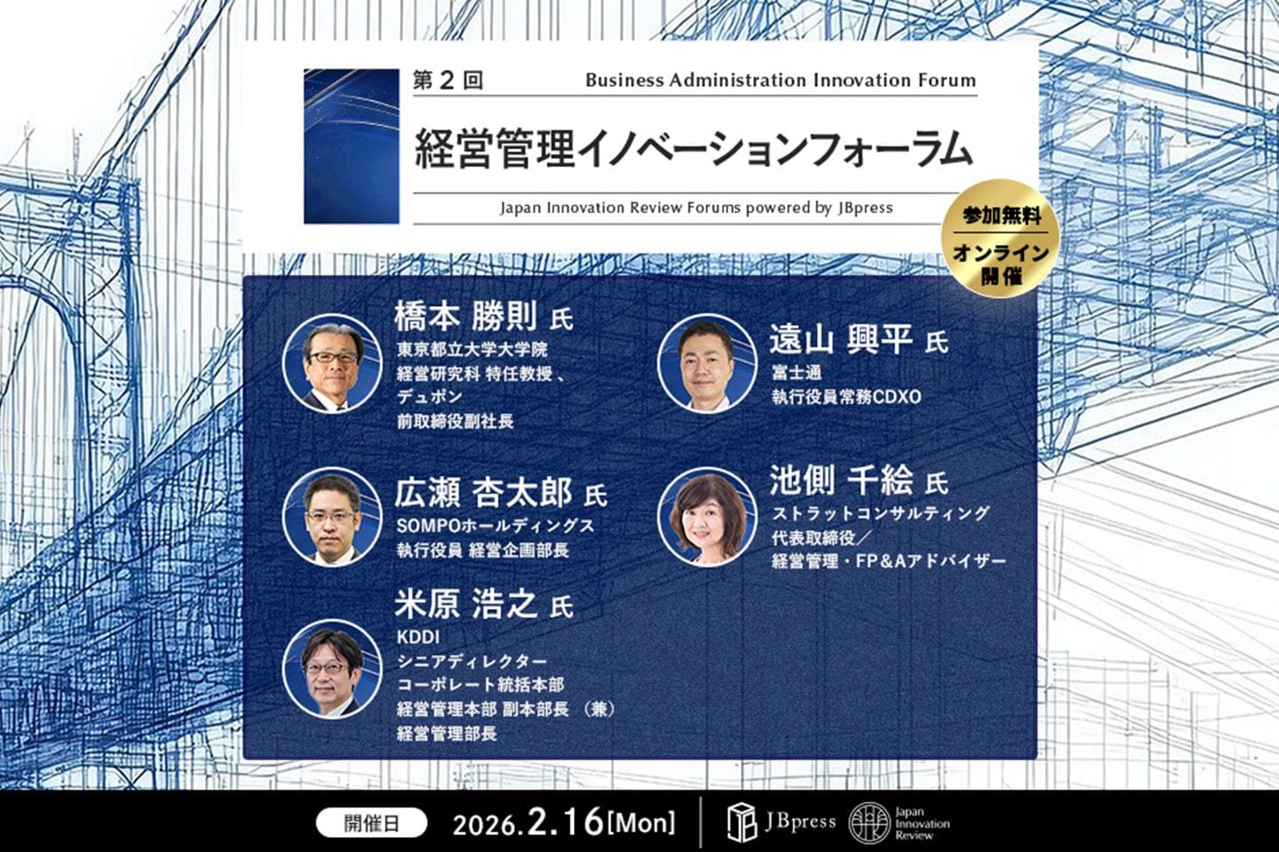 JBpress/Japan Innovation Reviewでは2月16日(月)に「第2回経営管理イノベーションフォーラム」を開催します。本セミナーでは、SOMPOホールディングス執行役員 経営企画部長の広瀬杏太郎氏と、経営管理・FP&Aアドバイザーの池側千絵氏による特別対談を配信。企業価値向上に向けて、SOMPOが実践する「FP&A 2.0」への進化について語ります。また、富士通 執行役員常務 CDXO(最高DX責任者)遠山興平氏は、同社が目指す「AIドリブン経営」について講演。KDDIのシニアディレクター コーポレート統括本部 経営管理本部 副本部長 兼 経営管理部長の米原浩之氏は、同社におけるFP&Aの取り組みと高度化について講演します。さらに、基調講演として、東京都立大学大学院 経営研究科 特任教授、デュポン前取締役副社長の橋本勝則氏が「変革のエンジンはコーポレートにある―CX推進と、ガバナンス・ERMの再定義によるコーポレート機能の再構築―」をテーマに講演します。ぜひご参加ください。