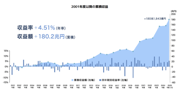 株式投資の割合を引き上げた際には安倍政権は野党から相当厳しく批判されていましたが、独立行政法人化前の2001年度から2024年度までの通算の平均運用利回りは+4.51%です。
