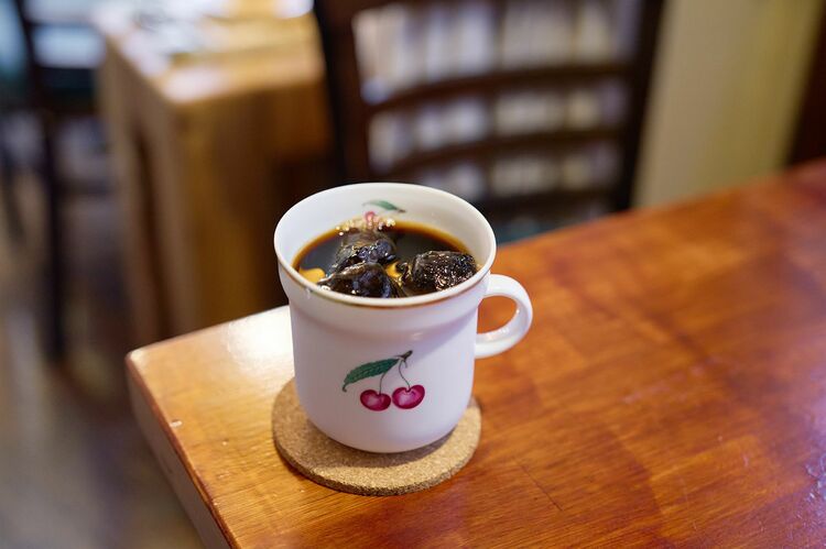 ネルドリップで淹れられたアイスコーヒー「カフェグラッセ」が陶器のカップで供されるのも乙
