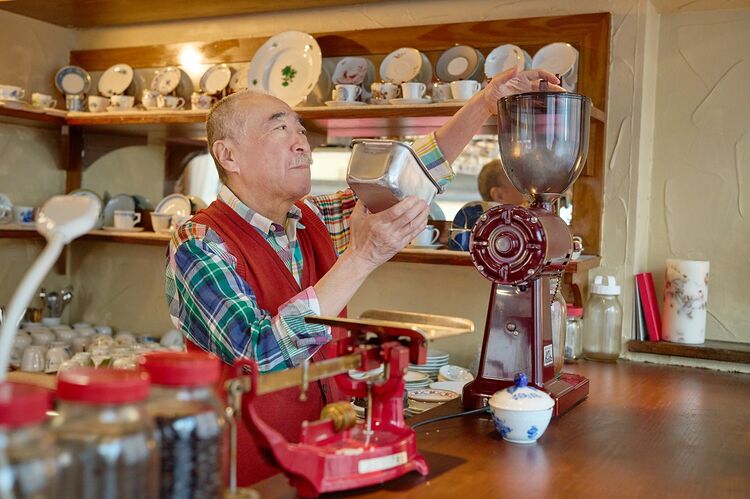 直嗣さんは「珈琲にまつわることをしている時間がいちばん楽しい」と話す。ブレンドにはコクテール堂の「五番町」と「楡」を使用、ストレートコーヒーは生豆を2年以上熟成させてから手網で焙煎する。お湯を注いだ瞬間に膨らむ泡をじっと見つめる真剣な眼差しに、こちらまでつい息を潜めてしまう。静かな店内には湯気と香りだけが漂い、白昼夢の中にいるような感覚に包まれる。丁寧に淹れられた一杯は、さらに表面の泡を掬い取ってアクを除く。これは泡が急激に空気に触れるとエグみが出るための工程で、一見地味だが、味の奥行きを支える欠かせないのだそう。「喫茶店の仕事は大変さが8割」と笑う直嗣さん。閉店後も仕込みや焙煎が続き、店を出るのは深夜1時を回ることも少なくない。