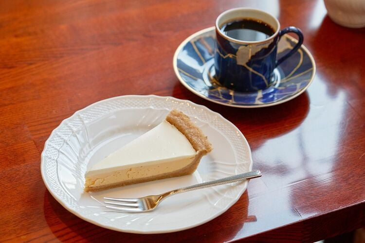 上がサワークリーム、下がチーズの2層になった「ベークドチーズケーキ」とブレンドのセット。おすすめは苦味のある「楡」