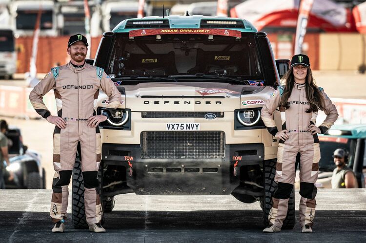2026年1月のダカール・ラリーに参戦したチーム「ディフェンダーラリー」。3台のディフェンダー OCTAベースの競技車両「D7X-R」のドライバーの一人、サラ・プライス(右)とコ・ドライバーのショーン・ベリマン(左)