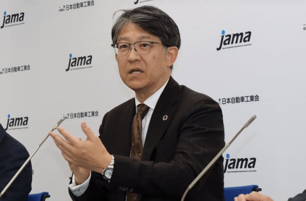 記者の質問に答える佐藤恒治 自工会会長(写真:自工会)