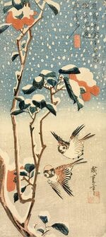 歌川広重《雪中椿に雀》大判短冊錦絵 天保3-6年(1832-35) RISD美術館蔵 Courtesy of the Museum of Art, Rhode Island School of Design, ProvidenceGift of Mrs. John D. Rockefeller, Jr.