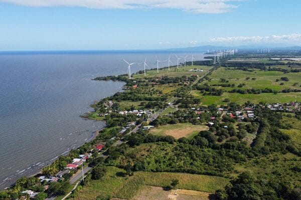 ニカラグア湖と湖岸に並ぶ風力タービン(2021年撮影、写真:新華社/共同通信イメージズ)