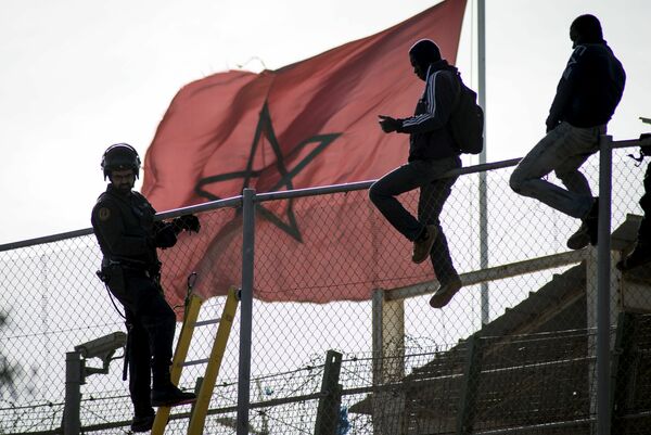北アフリカにあるスペインの飛び地、メリリャの国境フェンスを越えようとするアフリカ移民(写真:ロイター/アフロ)