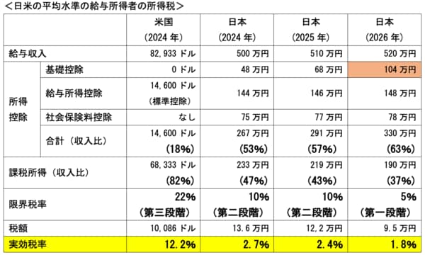 図6 ※扶養控除などは適用せず、基本的な所得控除のみで推計。米国の「標準控除」は、各種経費のほか医療費なども含め、実額控除の代わりに選択できる概 算控除の仕組みだが、ここでは「標準控除」を選択したものとして推計(米国は、伝統的には実額控除を選択する納税者が相当比率を占めたが、2018年 からのトランプ減税で「標準控除」の大幅な引上げがなされて以降は、約9割の納税者が「標準控除」を選択している)。 ※平均年収はOECDデータ(2024年)に基づき、日本の2025年・2026年は2%ずつ上昇と仮定。