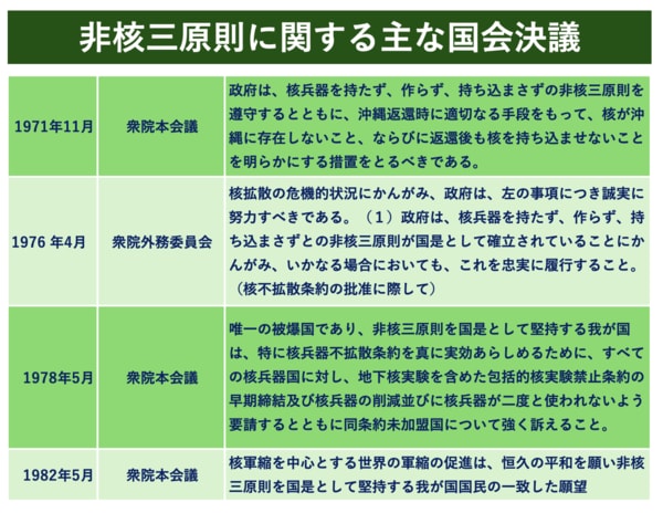 非核三原則の堅持はやがて、国権の最高機関である国会で何度も決議されました。法律による決定事項ではありませんが、度重なる国会決議を考えれば、まさに「国是」と呼ぶにふさわしい重みを持つものと言えます。
