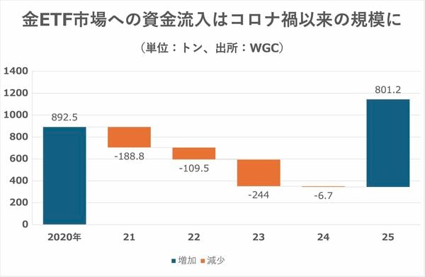 金の国際機関、ワールド・ゴールド・カウンシル(WGC)の集計で現物の金を裏付けにした上場投資信託(ETF)の残高は25年に801トン増え、増加量としては新型コロナウイルス禍が深刻になった20年の892.5トンに次ぐ規模になった。