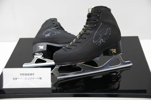 宇野昌磨のサインが入ったスケート靴と「YS BLADES」