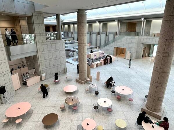 推薦委員会が注目したのは、建築家・乾久美子とグラフィックデザイナー・菊地敦己のコラボレーションによる空間構築だ。建築のメイン素材である御影石から抽出した色で什器をデザインしている。重厚で硬質な印象の建築から、ピンクやグレーのやさしい色合いが取り出されたことに驚く。無料の「じゆうエリア」に、大小のテーブルや椅子、クッションや本棚を点在させ、多様な居場所をつくっている。