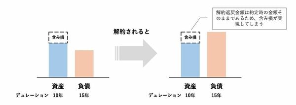 保険が解約されると、資産は時価評価されるのに対して、多くの場合、負債(解約返戻金)は約定時の金額になるため、金利が上がったとしても減額されません。従って、バーチャルなものであった「国債の含み損」が現実のものになってしまいます。