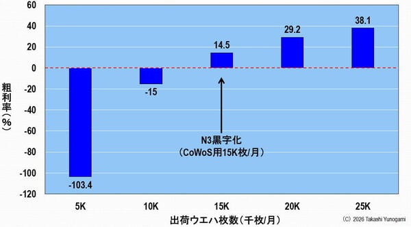 図7 JASM Phase2でN3によりAI半導体用ウエハを出荷した場合の粗利率(歩留まり90%、TSMCのCoWoSのCapacityを確保できたと仮定)出所:筆者の調査による