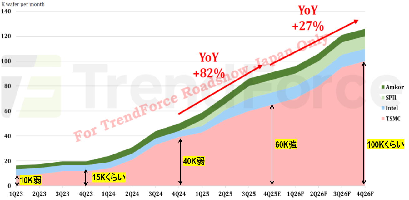 図8 2.5D(CoWoS)パッケージのCapacity(K/M)の推移出所:Joanne Chiao( TrendForce )、「2026年ファウンドリー市場の展望ー先端プロセスの優位性と成熟プロセスの飽和」(2025年12月16日)のセミナーのスライド
