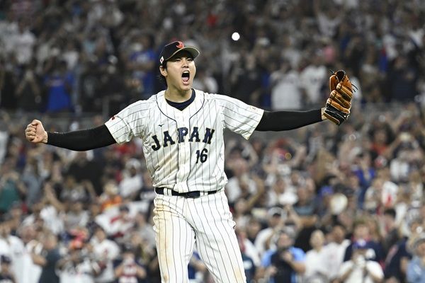 第5回WBCで優勝を決め、ガッツポーズする日本の大谷翔平(写真:共同通信社)