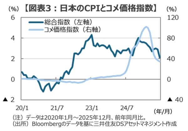 足元の経済指標を確認すると、12月の日本のCPIはガソリン補助金の影響もあって前月の+2.9%から+2.1%に急減速しました。また、これまで日本のCPIを大きく引き上げてきた食品、なかでもコメ価格は一部で流通在庫の積み上がりから店頭価格に調整の動きがみられ、12月のCPIのコメ価格指数は前年比で減速傾向が鮮明になっています(図表3)。