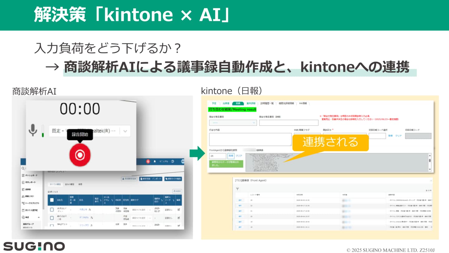 また、Umee Technologiesが提供するプラグイン・連携サービス「Front Agent」を活用した、生の顧客情報をAIがテキスト化しキントーンへ自動連携する取り組みも進行中だ。「営業担当が取得したお客さまの生情報をAIが文書化し、キントーンに自動で反映できるようにしています」。