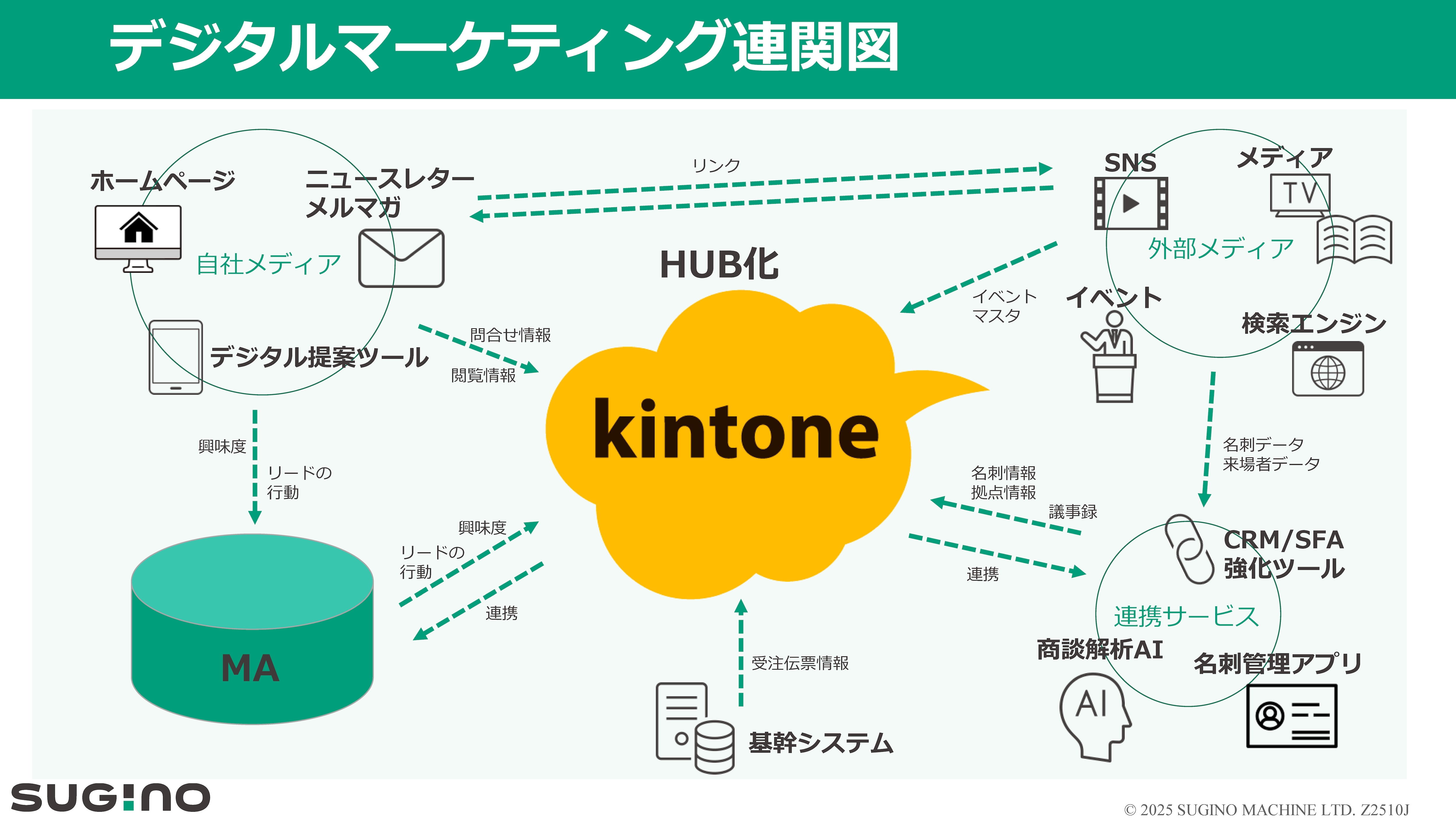 こうしてキントーンを中心に据え、社内外のシステムやメディアを連携させたデータ基盤を整備している。「キントーンをハブにして、基幹システムや連携サービス、自社メディア、外部メディアなどあらゆる情報をつなげています。私自身が広報を兼務しているのは、ホームページやイベントから取得したお客さまのスコアをリード情報として営業につなげるためです。一定スコアに達したお客さまについては『この方はこの商品に関心が高いようです』と営業へ通知しています」(山田氏)