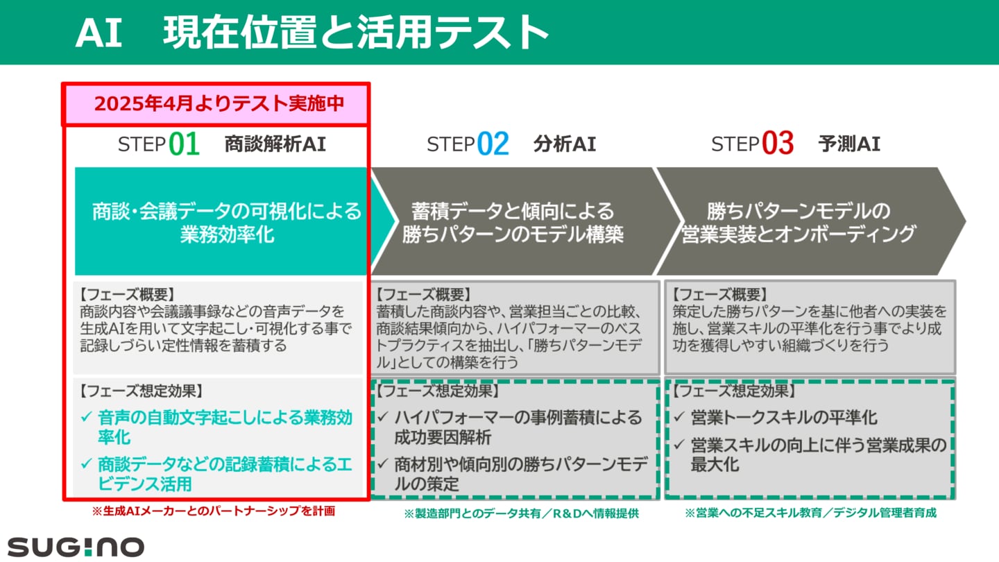 スギノマシンでは現在、営業活動におけるAI活用を3段階に整理し、「ためる」「分析する」「予測する」というロードマップを描いている。第一段階の「ためる」では、商談解析AIによって顧客との会話を正確にテキスト化・構造化し、キントーンへ連携する仕組みを整備した。これにより、営業担当者が聞き取った発言の意図や要望を正確に蓄積し、個々の商談データを資産として残せるようにする狙いがある。