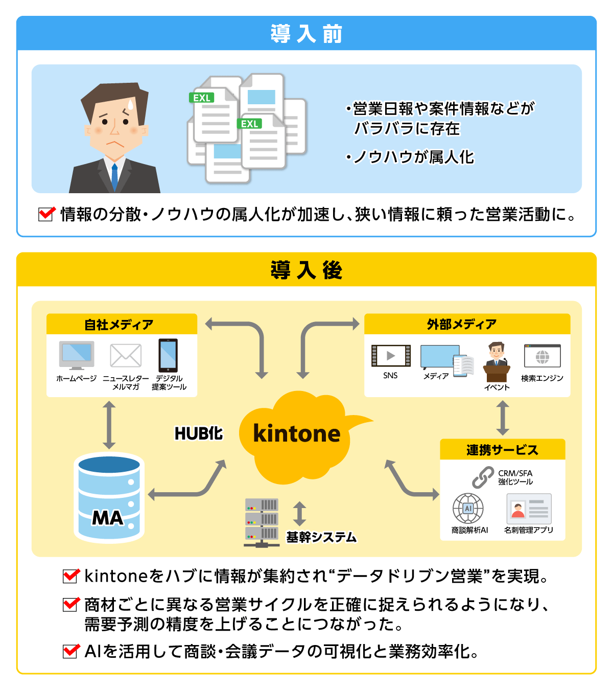 こうした分析の結果掲げたのが「デジタル営業改革」だった。そして、その実現に向けてデータを資産化し、営業戦略に活かすために選んだのがサイボウズのキントーンである。「マーケティングと営業手法を改善しなければお客さまの声も集まりません。データを貯め、それを活用していくためにキントーンを使う必要があると考えました」と山田氏は語る。