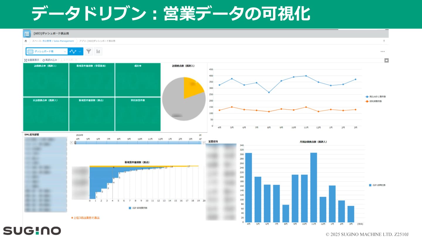 営業データの集計も進んでおり、新規顧客へのアプローチ率や訪問状況、個人やチーム別・営業所別の活動量を可視化している。これらの数値は営業マネージャーが週次で共有し、チームディスカッションの材料として活用できる。「営業にとっては厳しい数字もありますが、事実をベースに話し合うことで組織全体の改善につながります」と山田氏。キントーンを、活動管理だけでなく振り返りと戦略策定を支えるプラットフォームとしても位置付けている。