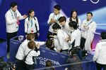 団体男子フリーの得点を確認し、顔を覆う佐藤駿(中央)の肩をたたく鍵山優真(同右)ら 写真/共同通信社