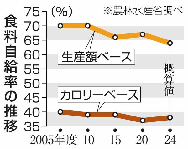 日本の食料自給率の推移(グラフ:共同通信社)