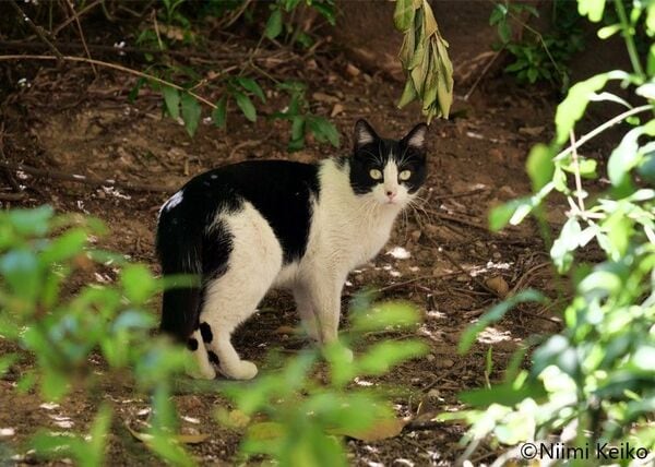 公園の植え込みを歩いていた猫がふり返りました。この公園には、猫たちの家が数多く設置されていました。