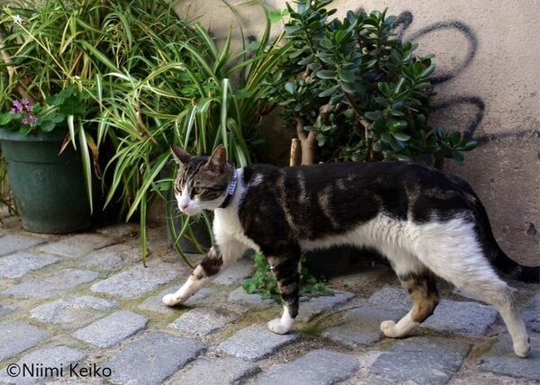 電話番号が書かれた首輪をしていましたが、名前はありません。ちょうど猫に話しかけた人がいたので聞いてみると、「毎日見かけるから、そのたびに挨拶をしているけど、名前はわからない。どの家の猫かも知らない」とのことでした。