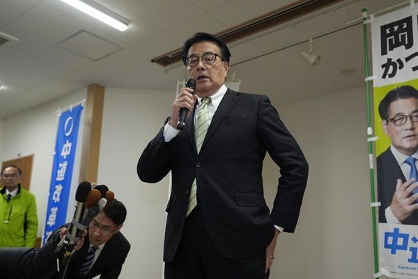 三重3区で落選が決まり、硬い表情で後援者らにあいさつする中道改革連合の岡田克也元外相(写真:共同通信社)