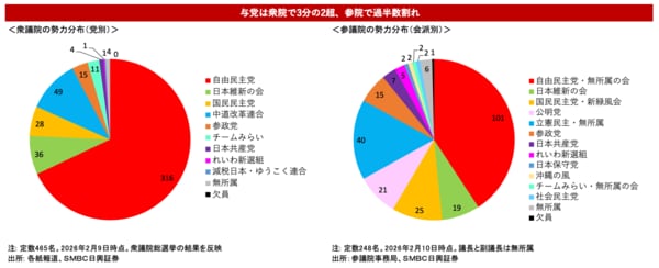 2月8日に実施された衆議院総選挙において、高市首相率いる自民党は316議席を獲得、定数465の3分の2を超える歴史的な大勝を収めた。単独の政党としては、2009年の政権交代時に民主党が獲得した308議席(定数480)を超え、過去最多である。