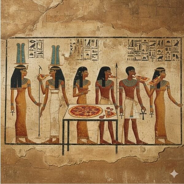 子供たちが大喜びする、あえて時代考証を間違えた算数教材:ピザパイを食べる古代エジプト人たち、著者が出力。手が3本ある人がいたり、バグだらけだったりしますが、それも面白い。以下も同じ。