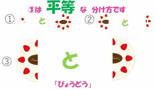 不平等な形で、ケーキを分ける可能性を例を示すと、小学1年での実施でも、ほぼすべての子供が「やだー」と答えます。