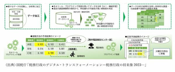 具体的には、申告書の情報や過去の調査データをBA(Business Analytics)ツール等で分析し、申告漏れの可能性が高い納税者を抽出するほか、滞納整理の場面では、電話や文書など、滞納者と最も接触できる可能性の高い手段を予測する取り組みが進められている。