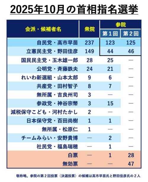 しかし、過去には首相指名選挙で激烈な戦いが繰り広げられたこともありました。象徴的なのは、1回目の投票で誰も過半数を取れず、上位2人による決選投票に進んだケースでしょう。決選投票は過去に5回。最も新しいのは、高市早苗氏が首相に選ばれた2025年10月です。