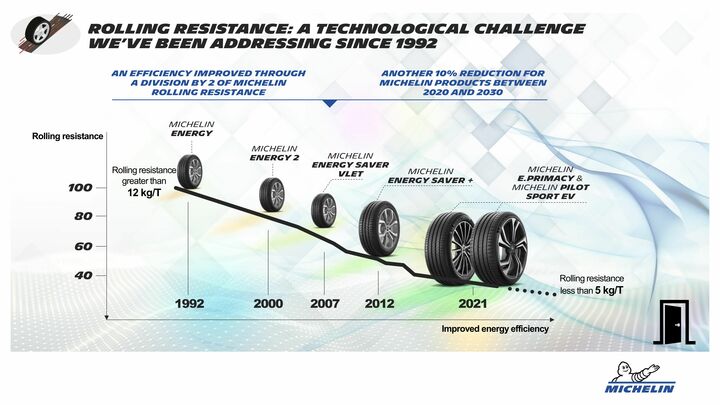 ミシュランの回転抵抗を低減し燃費改善に貢献するタイヤの歴史(出所:ミシュラン)拡大画像表示