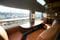 その言葉にふさわしく、車両はすべてがグリーン車で、カフェテリアも併設されている。特筆すべきは1号車のプレミアムグリーン車だ。なんと座席が1+1列で、定員もわずか20名。リクライニングしても背もたれが後ろに倒れずシートが前にスライドするバックシェルの座席で、本革を使用しレッグレストも付いた電動式。海を背景に、天窓や大きな側窓から差し込む光を浴びてくつろぐようすは、さながら高級リゾートホテルである。