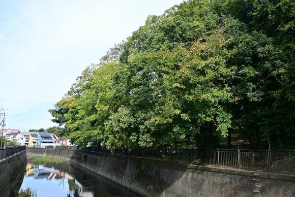 南西側から見た新川天神山城。岬のように突き出した台地の西側から南側にかけて、仙川が裾を洗うように流れている